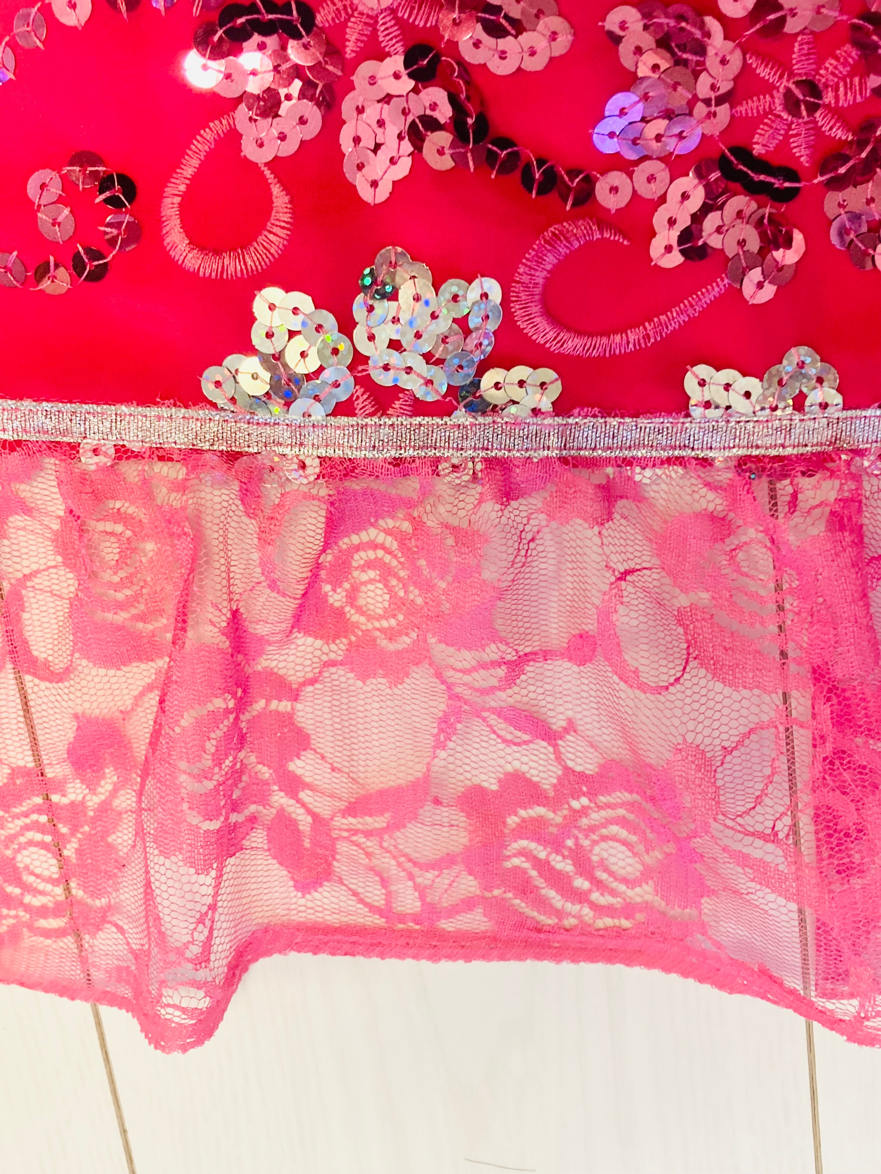 スパンコール刺繍の生地に裾レースのフリルを付けた、ヒップスカーフです。