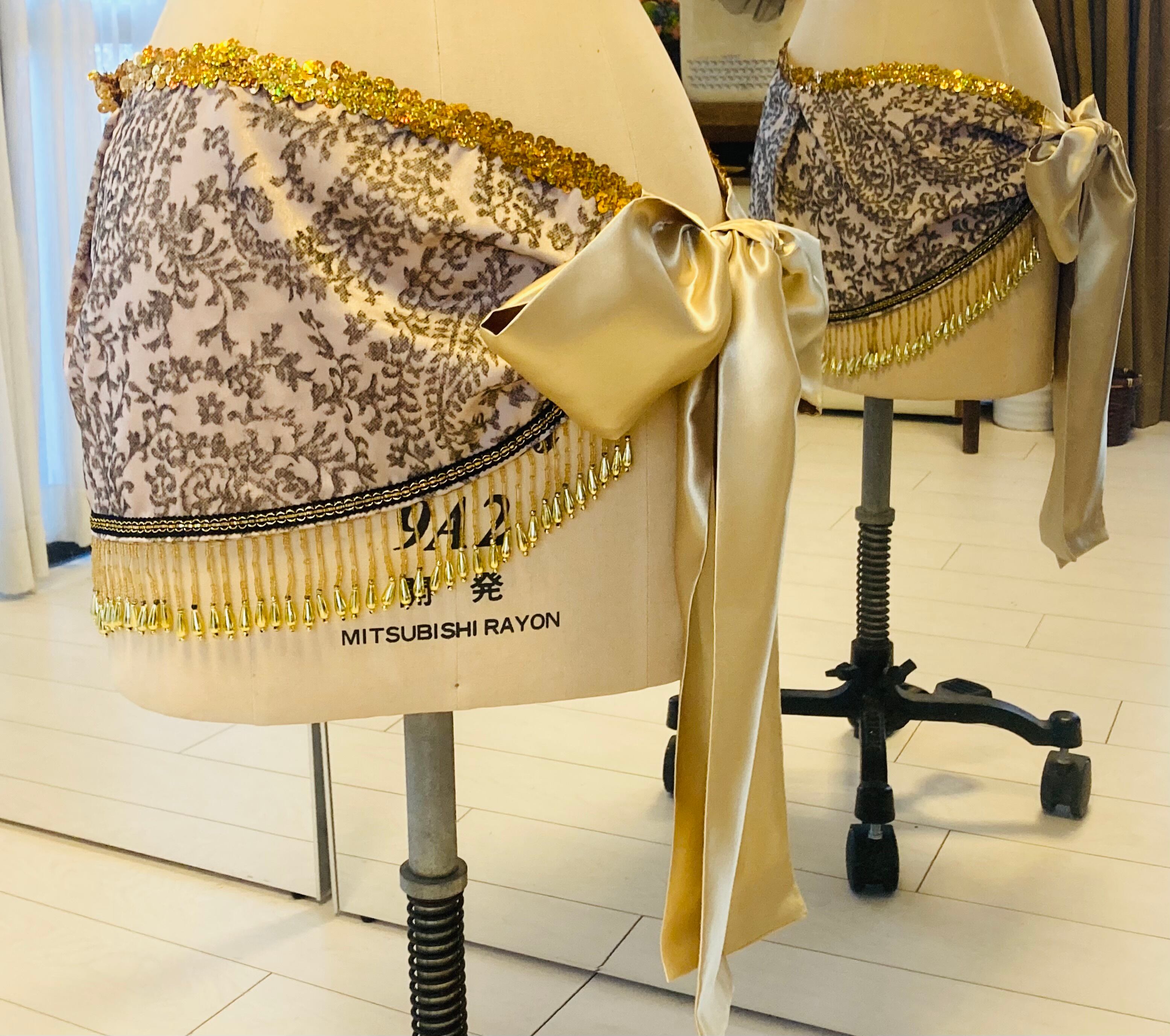 フロッキープリントの生地にビーズフリンジを裾に付けた豪華ヒップスカーフです。