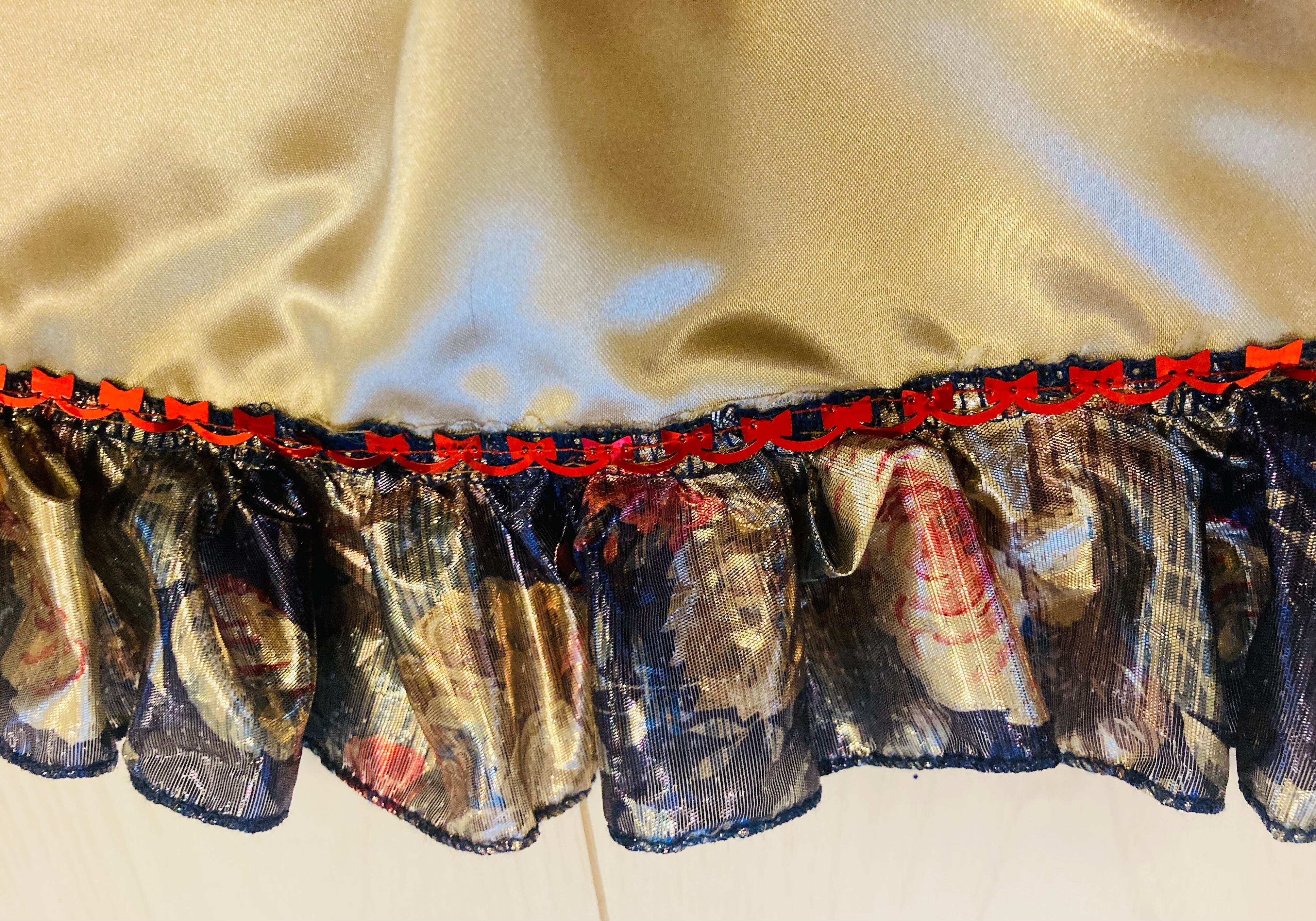 ゴールドのサテン生地にキラキラフリルをふんだんに付けた、ヒップスカーフです。