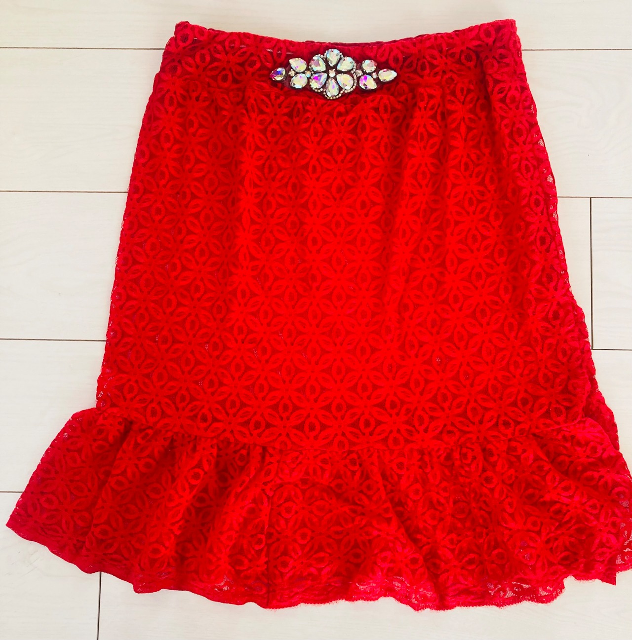 ウエストに豪華ラインストーンをあしらった、フリル付きスカート、片脇スリットあり。