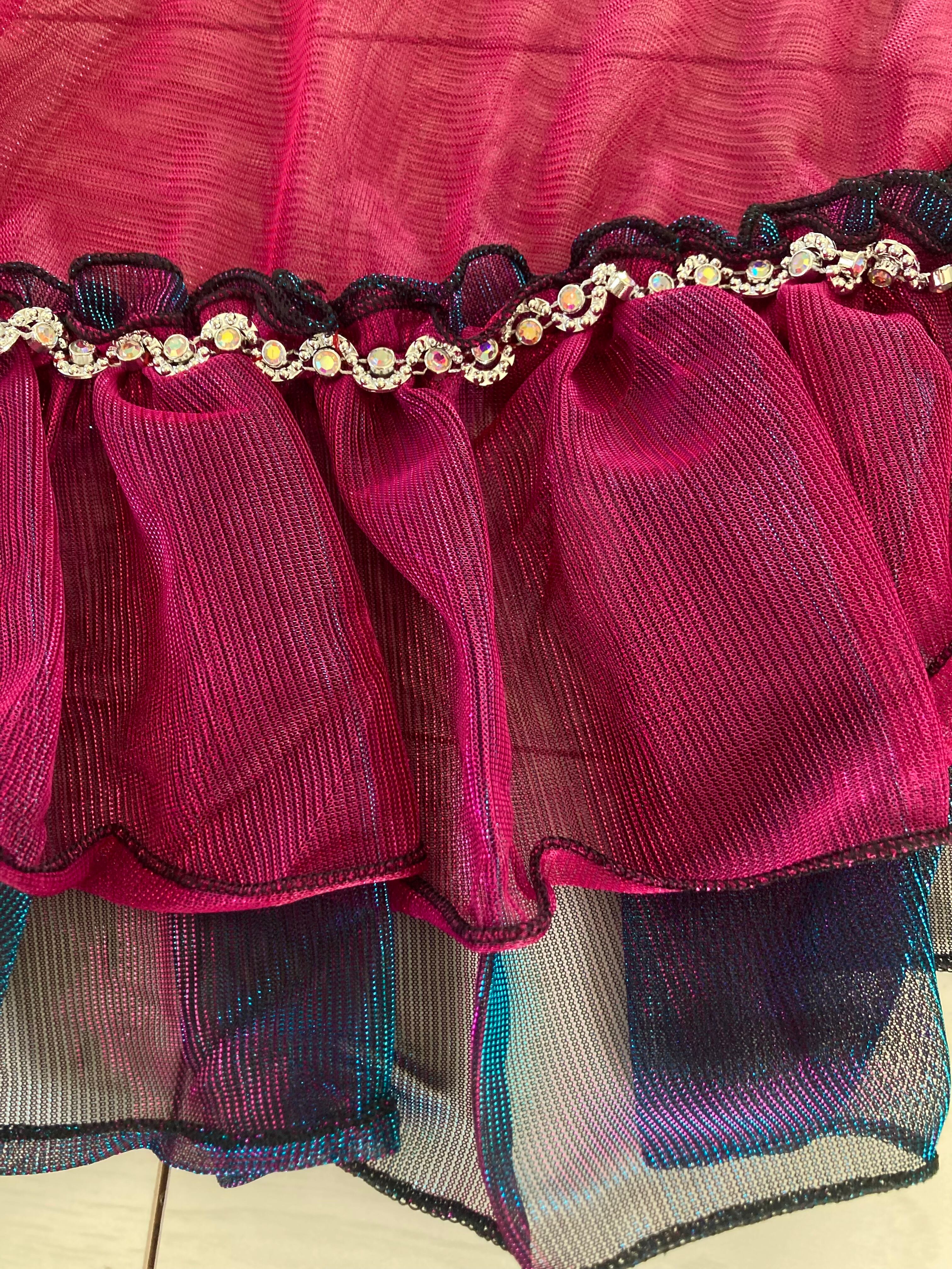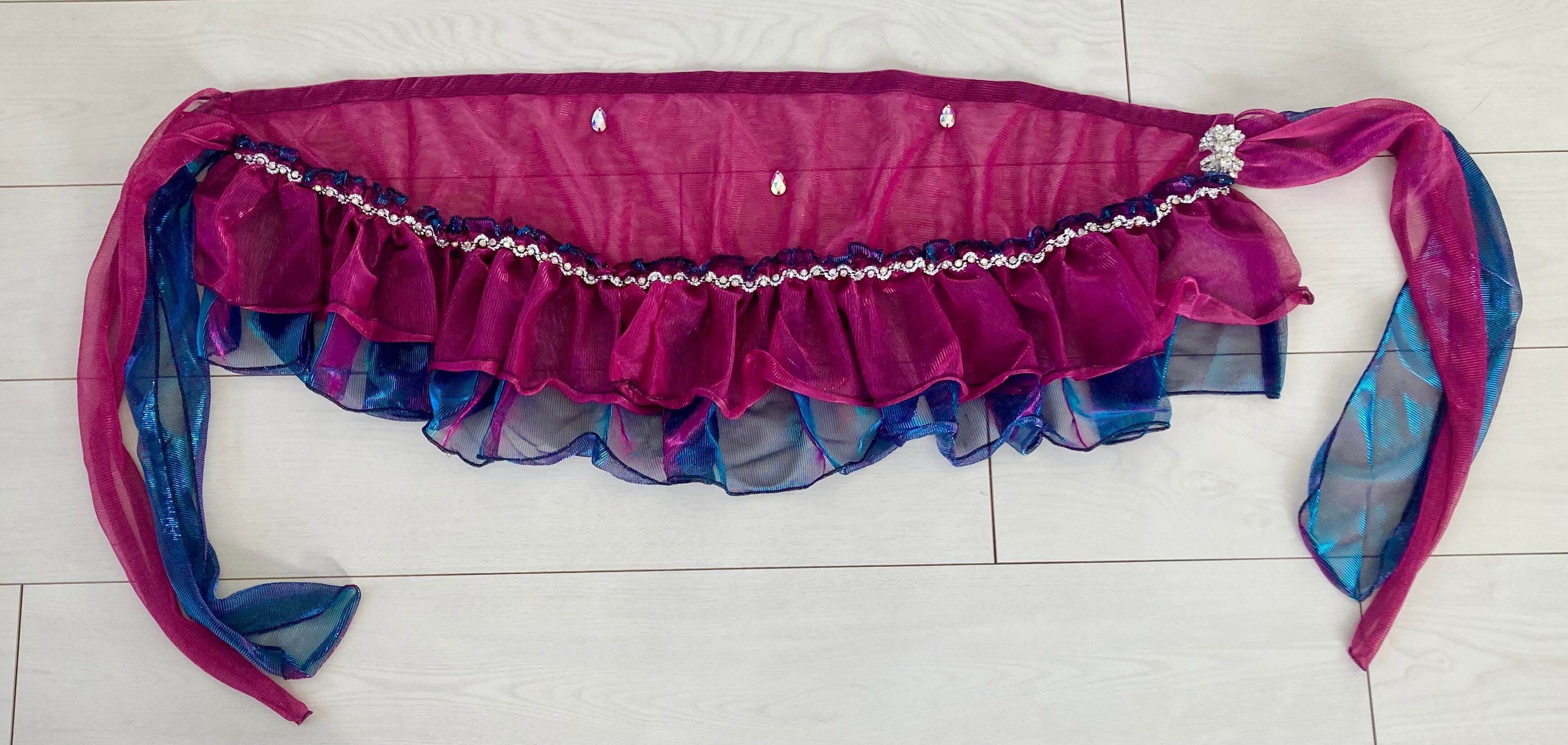 脇、フリル部分にラインストーンモチーフをあしらい、本体にもオーロララインストーンを付けた、ヒップスカーフです。