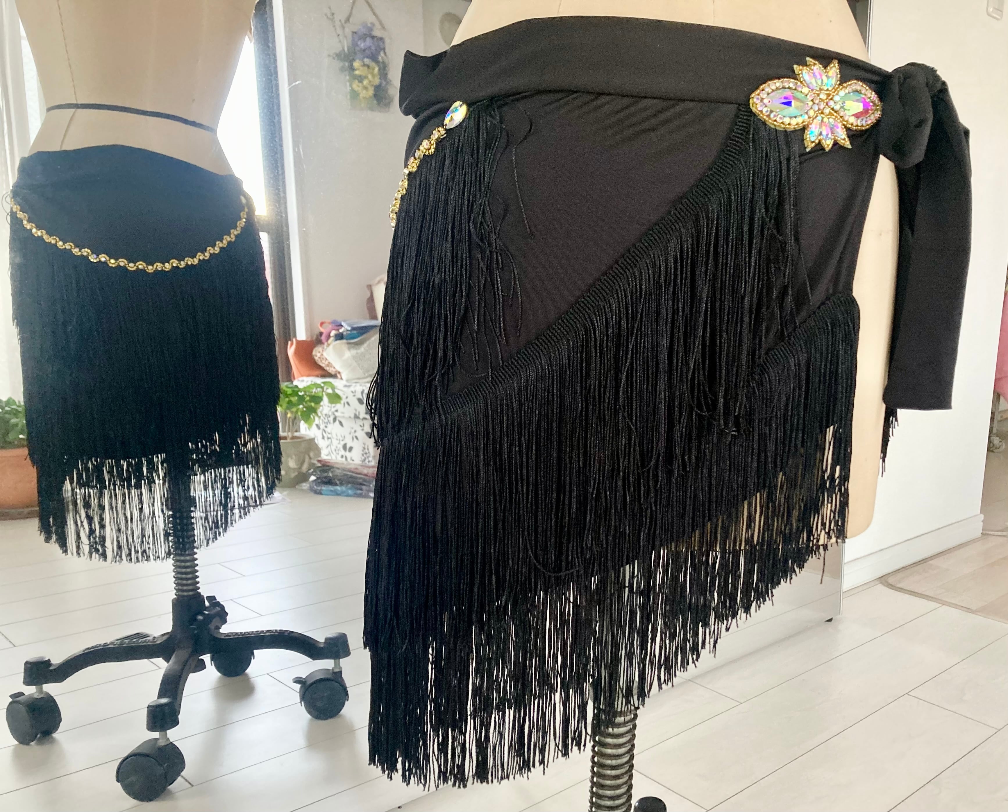 ラインストーンモチーフとブレードを付けた、おしゃれなデザインのフリンジヒップスカーフ