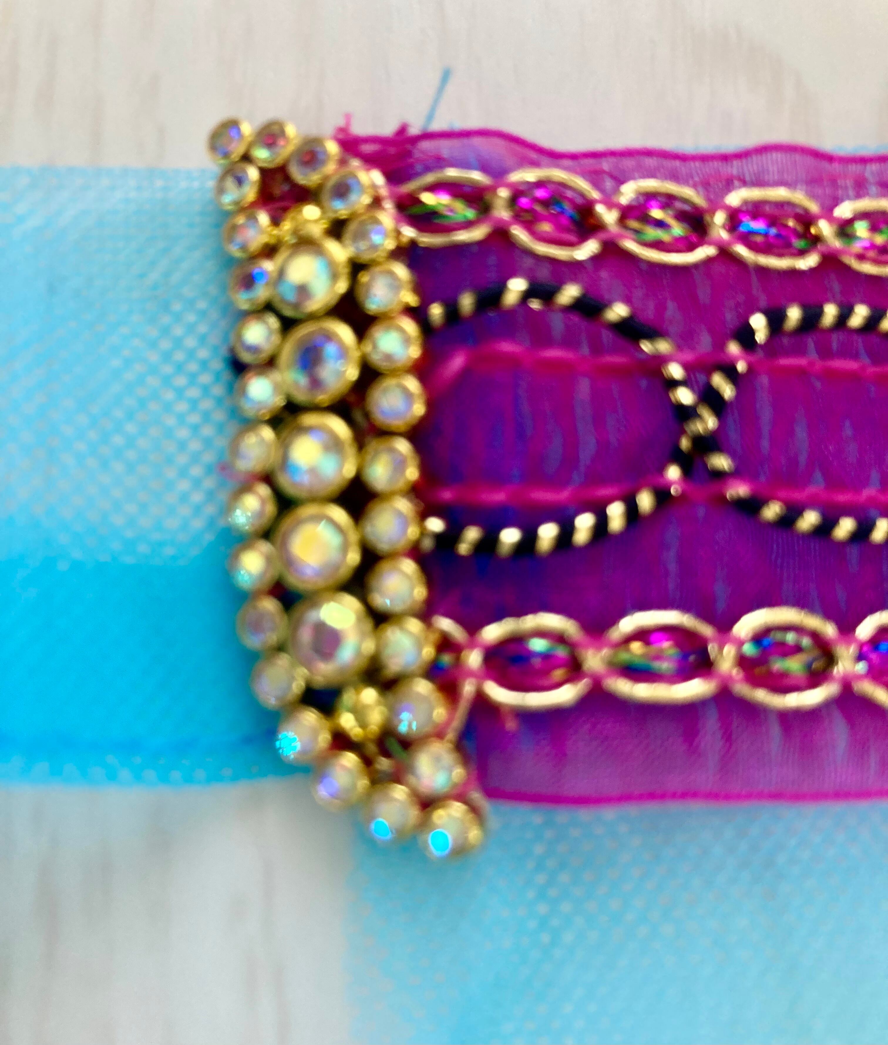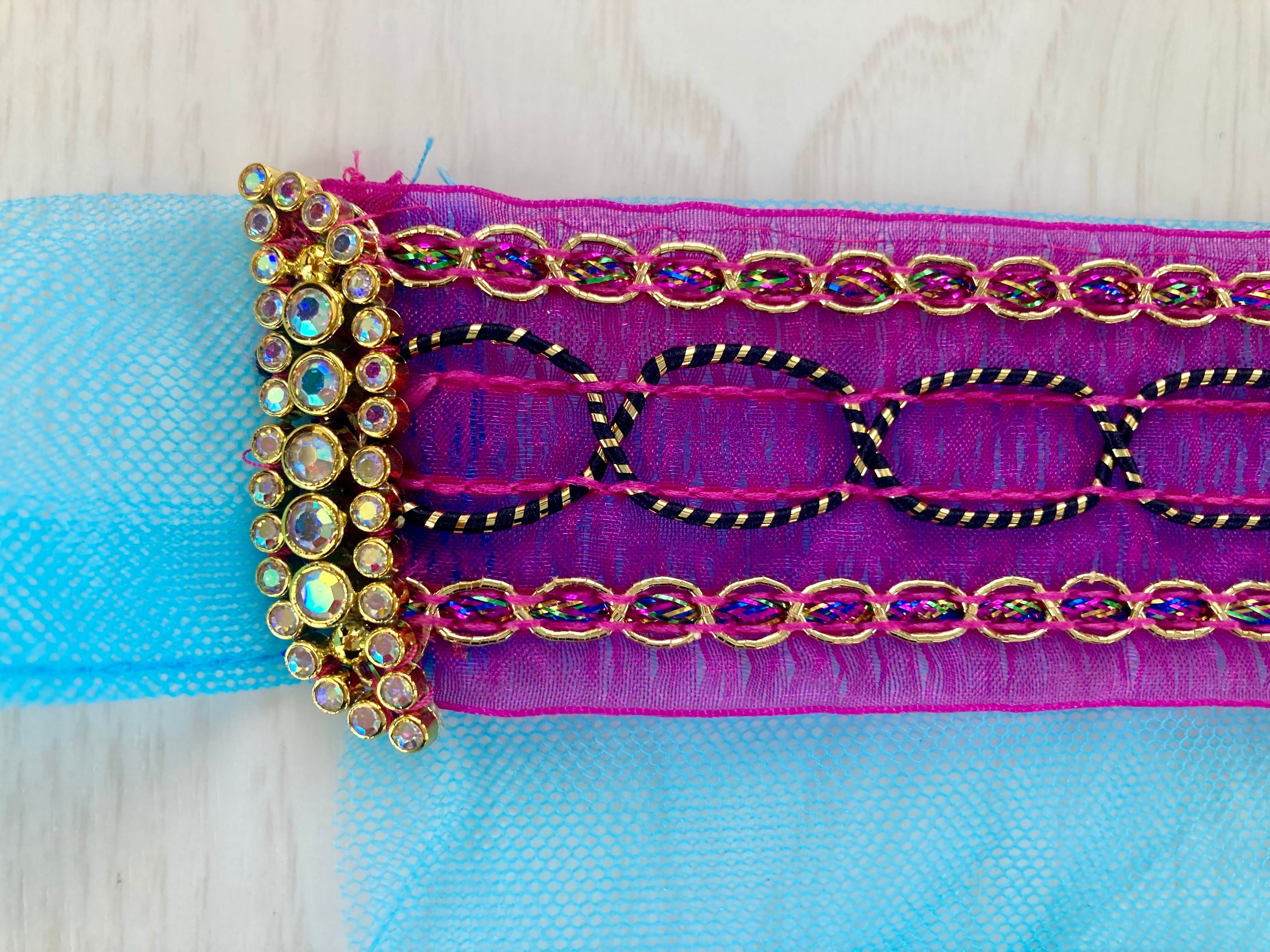 キラキラフリンジ2段重ねのヒップスカーフに、デザインテープとラインストーンモチーフをあしらった商品